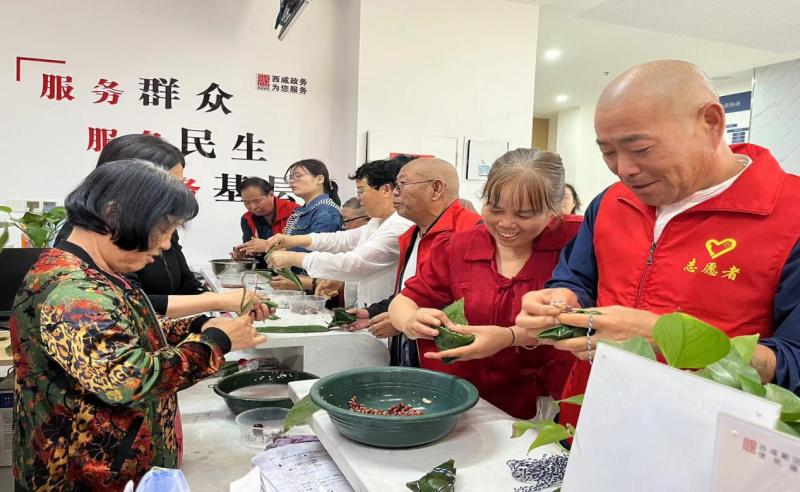 “粽”夏巧制作。一大早,志愿者和居民早早来到秦韵社区新时代文明实践所活动现场,将提前泡好的糯米、红枣、粽叶等包粽子的材料整理好,做好活动前准备工作。活动中,大家围坐在一起,捋粽叶、填糯米、压紧实、封口、扎捆,大家齐心协力,忙的不亦乐乎,一边交流包扎技巧,相互学习借鉴粽子造型,一边话家常,分享邻里趣事,整个活动现场弥漫着粽叶香和大家的欢声笑语,节日氛围浓厚,快乐而温馨。活动还邀请剪纸爱好者,为大家展示剪纸非遗文化,指导大家剪出一幅幅喜庆的作品,让社区居民切实感受到传统文化的独特魅力。