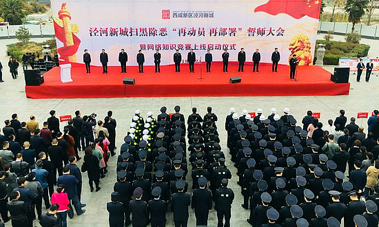 泾河新城党委委员、管委会副主任任炳群主持誓师大会,泾河新城党委委员、管委会副主任刘军通报新城扫黑除恶战果。西咸新区公安局党委委员、副局长刘钦、西咸新区扫黑办主任张利军、泾阳县人民法院院长王建宏、泾阳县人民检察院检察长郭云宏、泾阳县公安局局长刘国强出席大会。