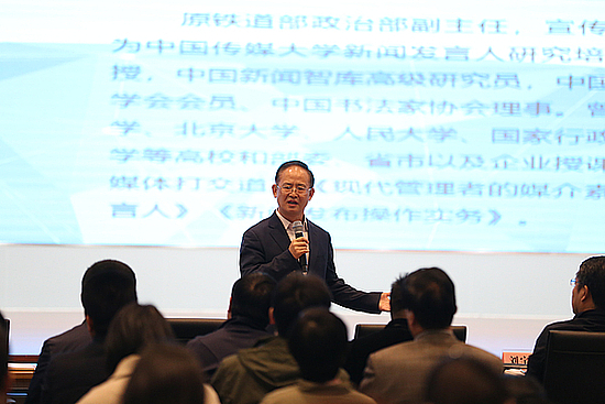 王勇平老师从全媒体时代对领导干部提出的能力素质要求,领导干部如何面对媒体及相关技巧等方面分享了自己在国内外从事新闻发言工作的经历和体会,通过近年来大量国内外突发的政治、经济、社会舆情事件,深刻揭示了做好面对媒体工作的极端重要性。在近三个小时时间,王勇平老师始终面带微笑,保持着挺拔的站姿,他全程不用讲稿,对新闻发布的规律、原则、方法技巧等娓娓道来,整节课程幽默风趣,生动深刻,给全体参会人员以启示和触动。