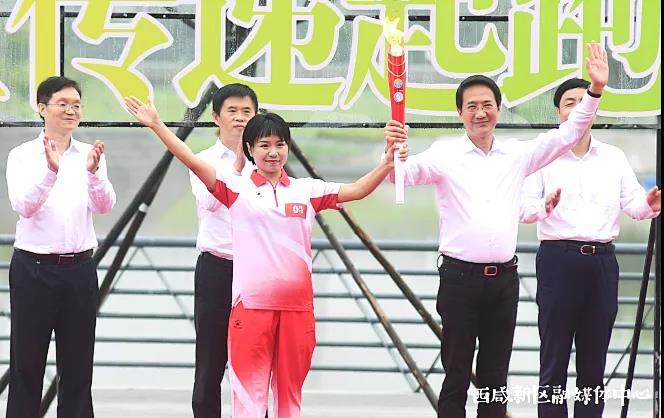 随后,十四运会和残特奥会圣火在一双双注视的目光下被迎入仪式台圣火盆,熊熊火种燃烧在沣河之畔,王勇将点燃的火炬交给杨仁华,共同向全场展示,杨仁华将火炬授予第一棒火炬手李雅芬。李雅芬高举火炬,缓缓跑下仪式台,十四运会和残特奥会火炬传递西咸新区站正式开跑。