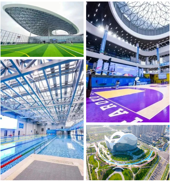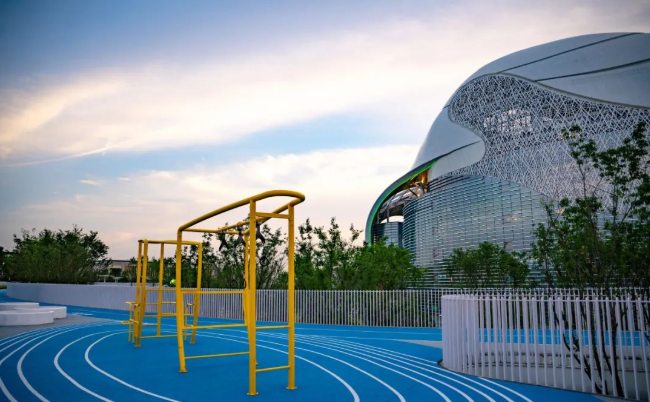 充满现代科技感的流线型道路与天桥,搭配大气简约的体育馆、丰富多彩的艺术展区与高低错落的景观树林,形成运动、休闲、艺术为一体的新型城市绿色空间。