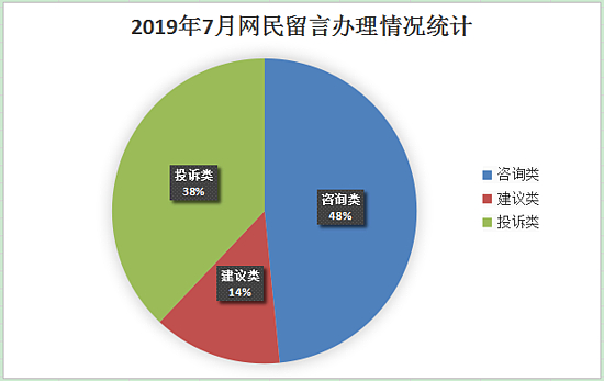 2019年7月共计接收公众来信564封,其中咨询类273封,建议类77封,投诉类214封;共计办结信件536封。