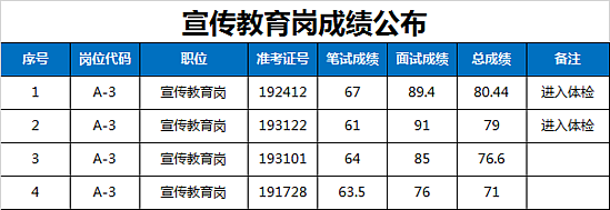 西咸新区管委会公开招聘派遣制员工资格复审、笔试、体能测试及面试工作已于2019年1月19日全部完成,现将面试成绩及进入体检人员名单公告如下: